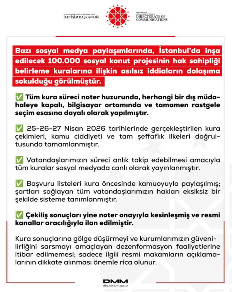 “25-26-27 Nisan 2026 tarihlerinde gerçekleştirilen kura çekimleri, kamu ciddiyeti ve tam şeffaflık ilkeleri doğrultusunda tamamlanmıştır. Vatandaşlarımızın süreci anlık takip edebilmesi amacıyla tüm kuralar sosyal medyada canlı olarak yayınlanmıştır. Başvuru listeleri kura öncesinde kamuoyuyla paylaşılmış, şartları sağlayan tüm vatandaşlarımızın hakları eksiksiz bir şekilde sisteme tanımlanmıştır. Çekiliş sonuçları yine noter onayıyla kesinleşmiş ve resmi kanallar aracılığıyla ilan edilmiştir. Kura sonuçlarına gölge düşürmeyi ve kurumlarımızın güvenilirliğini sarsmayı amaçlayan dezenformasyon faaliyetlerine itibar edilmemesi, sadece ilgili resmi makamların açıklamalarının dikkate alınması önemle rica olunur.”